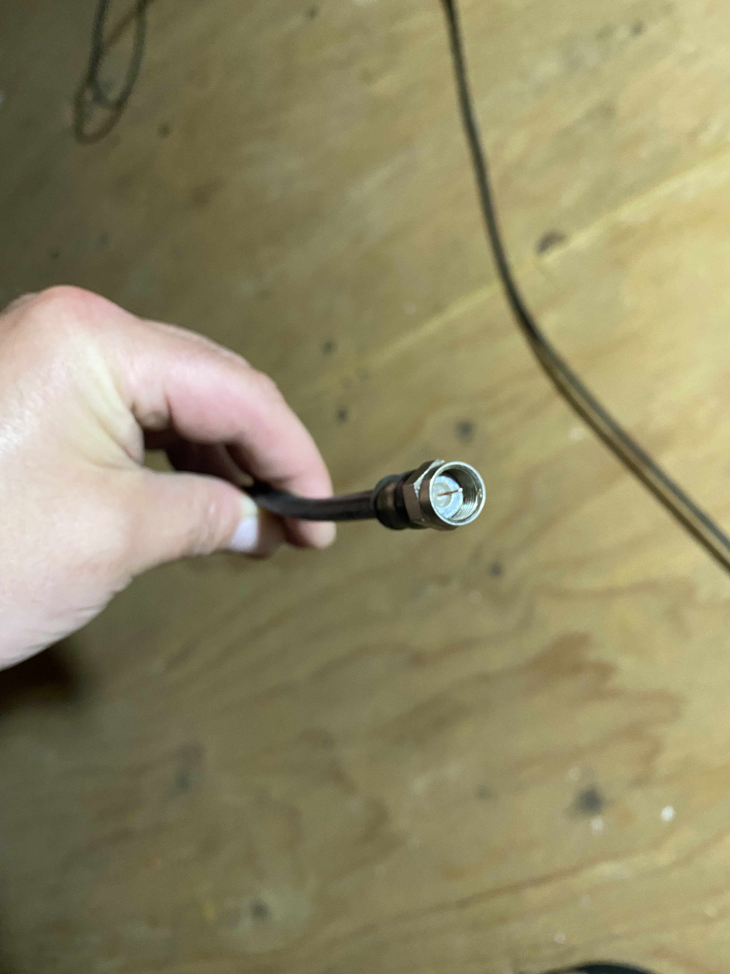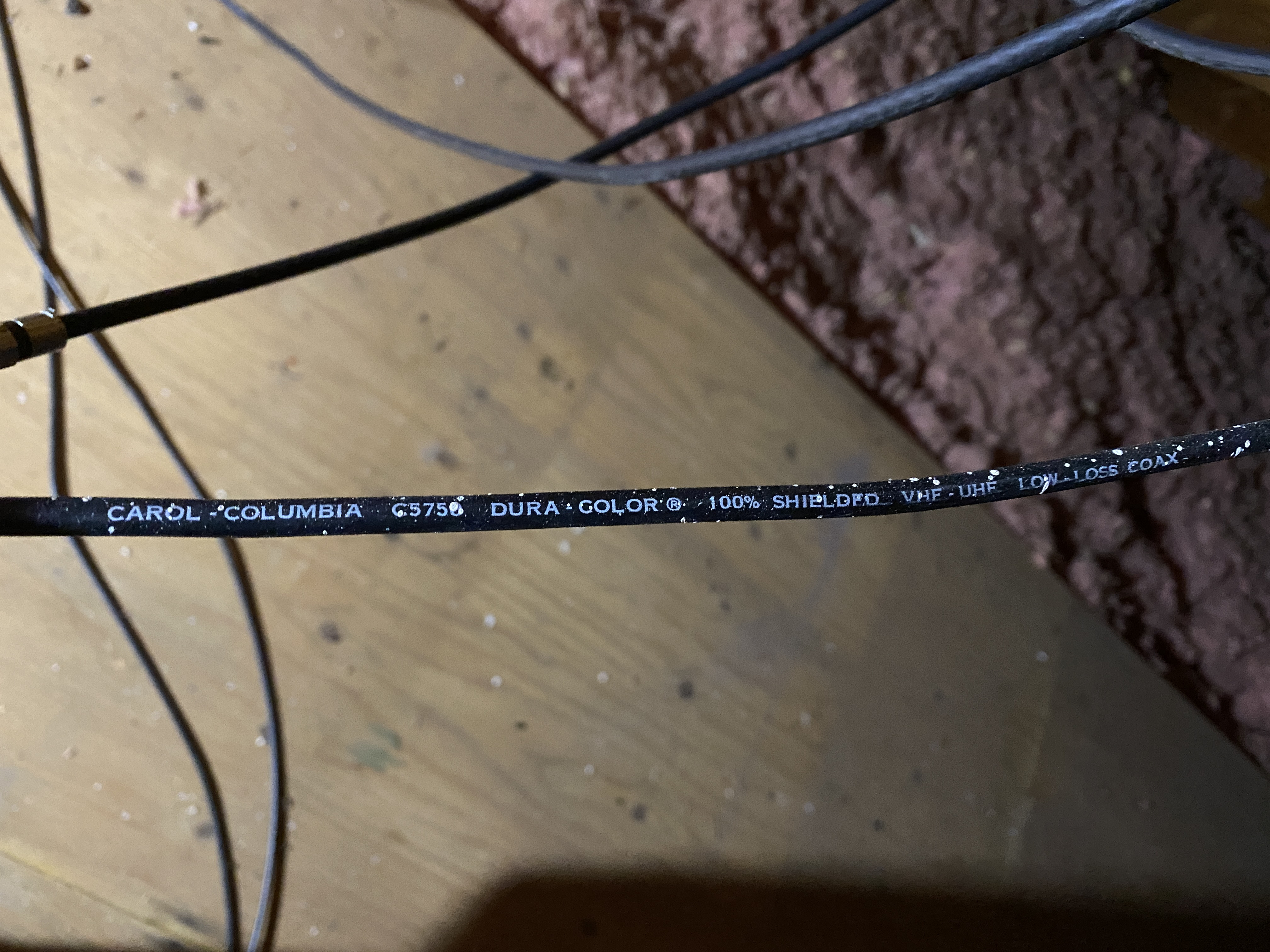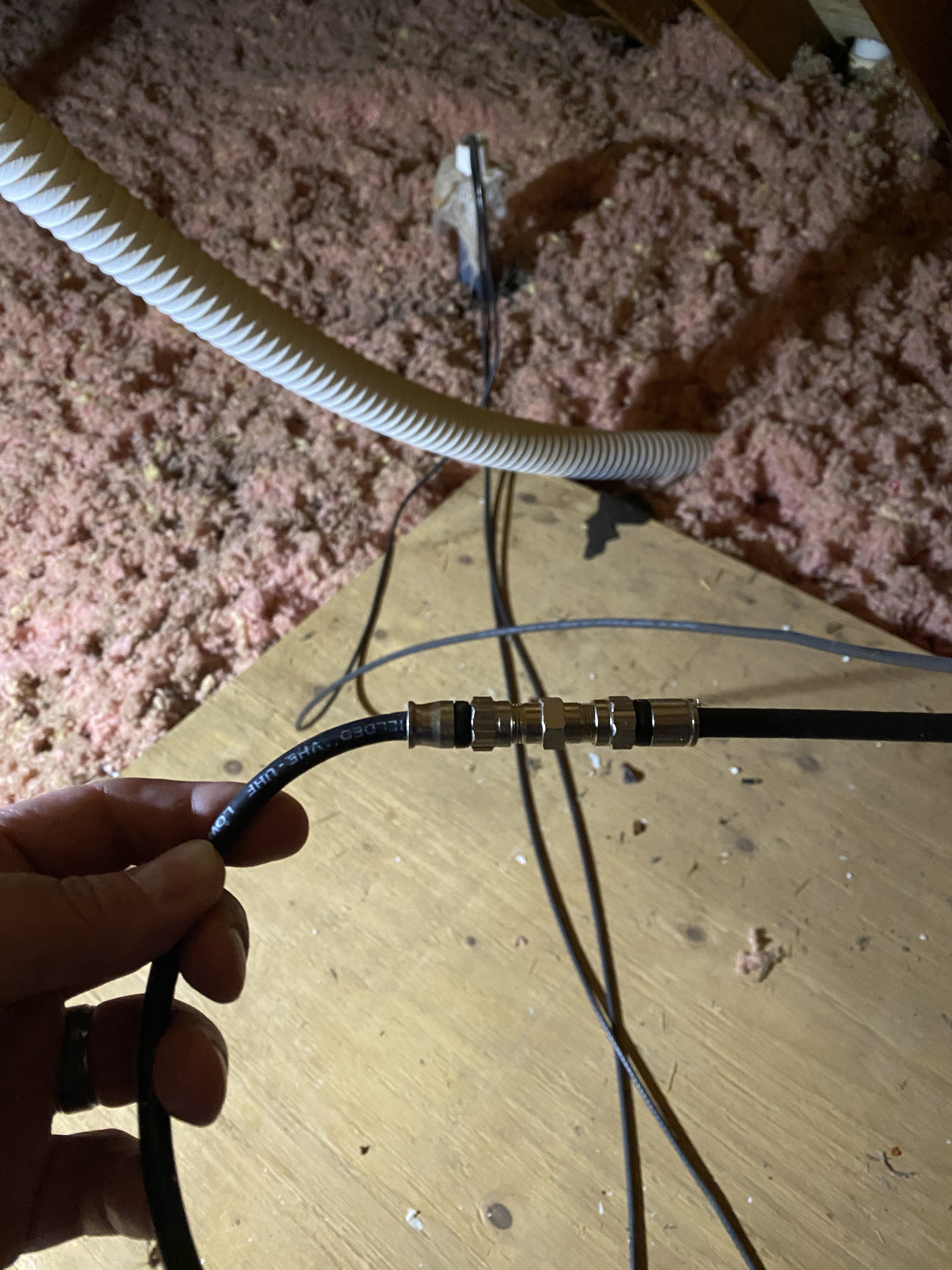 This is what the thinner cable looks like in the attic as well as the end connector. You can also see the barrel connecting the (what I think is the) good cable with the cable that says VHF/UHF that runs from the attic down into the walls of the rooms where the two upstairs MoCA adapters are.