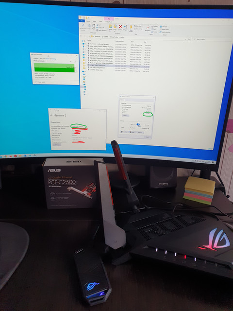 On a sidenote, if I use the regular 1 Gig Lan port the router and the regular 1 gig network card on my pc, I get transfer speeds up to 107 MB/s.
