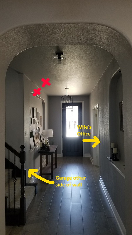 On the left of the hallway, that wall with pictures, is our garage. I have already ran a network cable out to the ceiling there just in case.