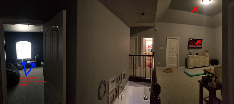 Upstairs, on the left is my media room that has my other router and the pre-existing network cables. In the game room on the right where the TV is, that is where the girls' Nintendo Switch is, where we CONSTANTLY have wifi issues.