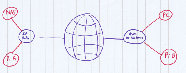 Wireguard is setup on both Raspberry with PiVPN and they can communicate together. My computer access the NAS through the wireguard tunnel. One static route is defined on the Asus router to redirect requests from PC to the Raspberry which send it in the tunnel. I choosed to have two Raspberries to avoid hosting the Wireguard client on my Asus router and potentially being CPU bottlenecked. But no luck here...