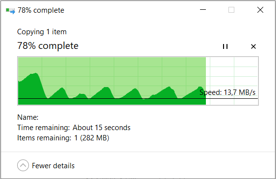 Problem is when I try to copy the files from my NAS to my laptop. It starts ok (about 70 MB/s) but then it drops drastically to 15 MB/s and from there its sluggish until the end. Here is the graph for better explanation: