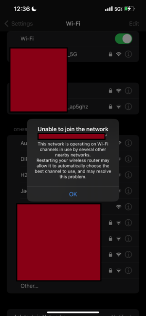 Now, it's nothing but headaches for not only the wireless, but even the wired connections. I don't get how that's even possible. One of the computers upstairs is wired to one 82U and it's getting 1000 ping and severe lag in the games. My computer that plugs directly into the downstairs 88U is also taking forever to even pull up the asus router dashboard, let alone navigate the web. None of the wifi devices will connect to the asus aimesh wifi and I'll either get one of several errors: wrong password (which I know is 100% correct password), cannot connect, cannot get IP, and our iphones give the attached error regarding channels. The only devices still working fine without lag are those that were previously connected to the TP-Link AP in the attic PRIOR to me adding the aimesh routers.