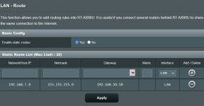 Hello, Could someone help me set up routing table rules on my network The LAN-WAN network looks like this; (Modem from ISP) - (WAN Router ASUS RT-AX88U (192.168.50.0) LAN- (WAN Router TP-LINK192.168.7.0)